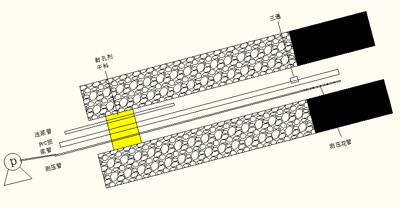 根據(jù)孔深及見煤深度確定回漿管及測壓管的長度,先將一根回漿管的一端用專用堵頭封閉,隨后將測壓管花管固定在該回漿管路前端,兩根管路端頭要平齊,接著將這兩根管路下入鉆孔內(nèi),然后依次連接回漿管(連接處使用直通連接,并均勻涂抹專用膠水),在見煤點處使用三通連接回漿管,隨后依次使用直通連接回漿管送入孔內(nèi)。同時也要注意每隔2米距離對回漿管和測壓     管使用膠帶進(jìn)行加固。在將這兩根管路送入孔內(nèi)預(yù)定位置時(即回漿三通位于見煤點位置),向孔內(nèi)下入一根1.5米長的注漿管路,注漿管外漏孔口長度為0.3米,回漿管外露長度為0.2-0.25米。然后,在回漿管和注漿管上分別安裝PVC球閥和鋼球閥(兩球閥要錯開安裝,不能互相影響使用)然后,將這三根管路使用鐵絲或木楔固定牢固;